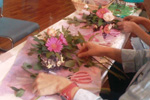 花材の種類は、ガーベラ、スプレーバラ、ワックスフラワーなどで、 色は、ピンク系、オレンジ系、黄系の3種類用意しました。